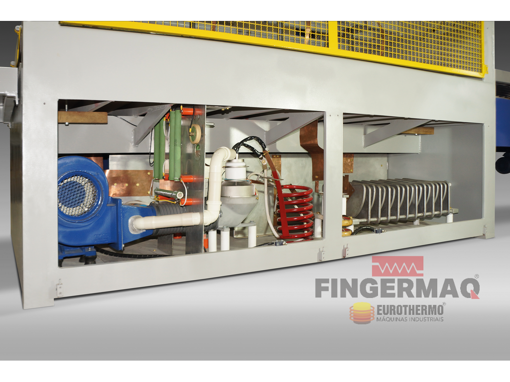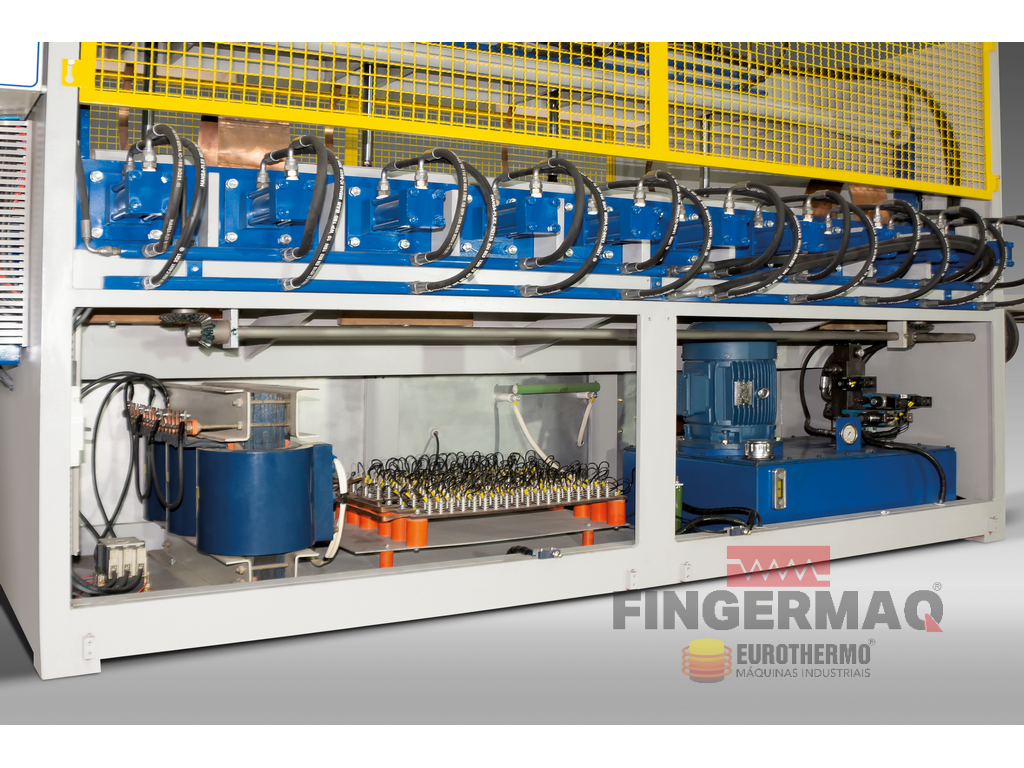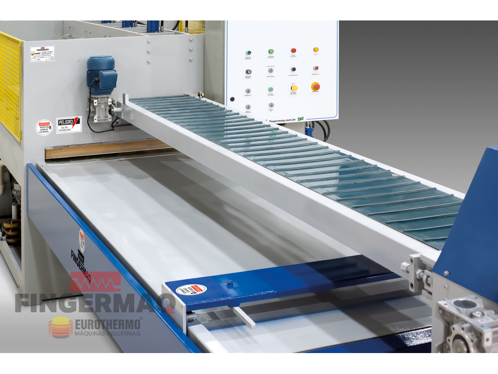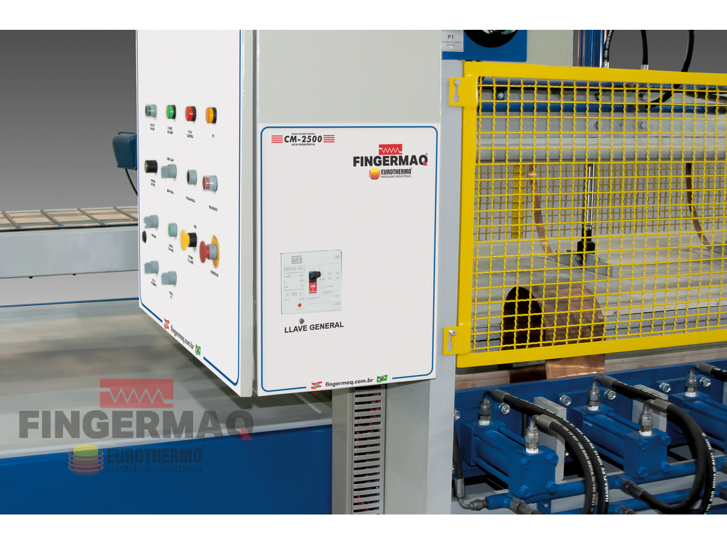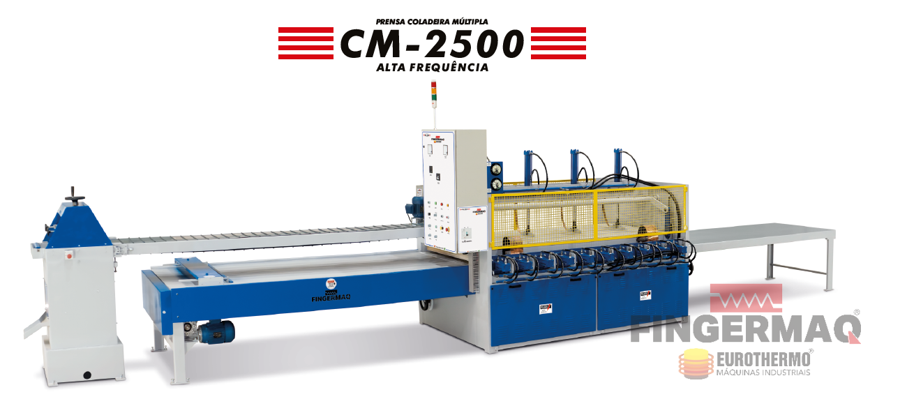 A PRENSA COLADEIRA MÚLTIPLA DE ALTA FREQUÊNCIA foi desenvolvida para Colagem (Emenda) lateral de Lâminas de Madeira, Painéis e Blocos por Ondas de Rádio Frequência (R.F.), acelerando o processo de secagem da Cola por perda dielétrica.